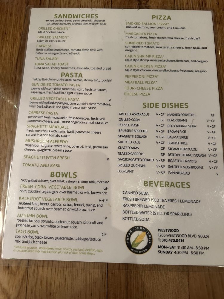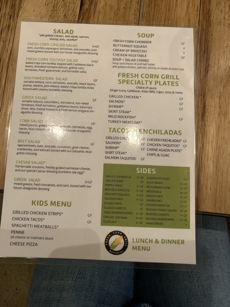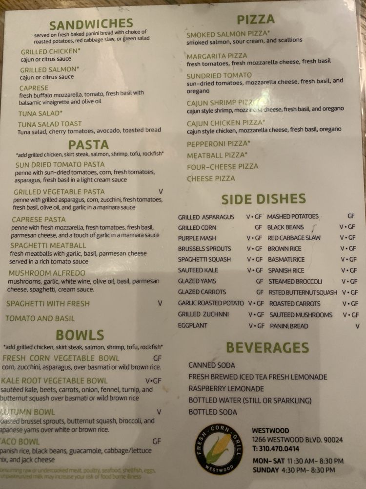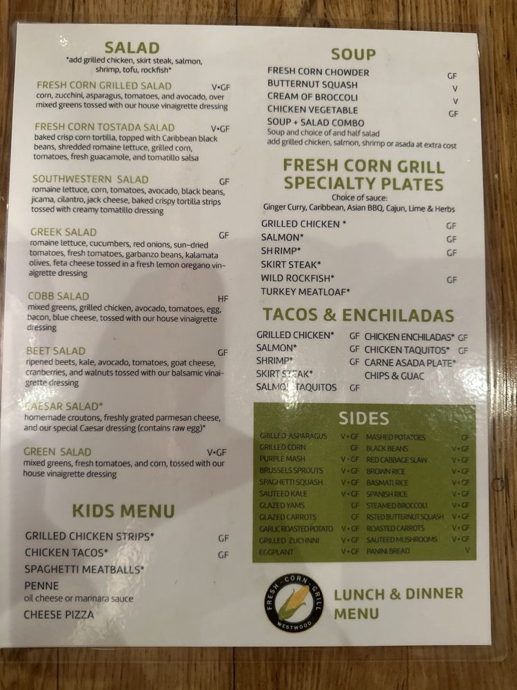 Fresh Corn Grill, located in Los Angeles, offers a diverse menu featuring New American, Italian, and Mexican cuisine. With options for delivery, takeout, and reservations, this restaurant caters to a variety of preferences, including vegan and vegetarian diets. The casual atmosphere with outdoor seating, private dining, and dog-friendly policies make it a versatile choice for any occasion. From fresh salads like the signature Fresh Corn Grill Salad to hearty soups like Corn Chowder and Butternut Squash Soup, this restaurant offers a range of healthy options. Specialty plates like Chicken Plate, Salmon Plate, and Turkey Meatloaf provide satisfying protein choices with a variety of sides. With a focus on quality ingredients and flavorful dishes, Fresh Corn Grill is a must-try for those looking for a delicious and nutritious dining experience.
